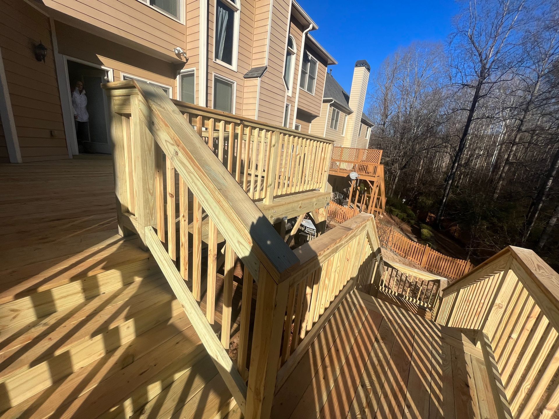 We install weather-resistant decks because they're practical and long-lasting. We'll build your deck using fresh, pressure-treated lumber, then wait up to two and a half months before painting or staining it. This allows the wood to fully dry and cure. This process: